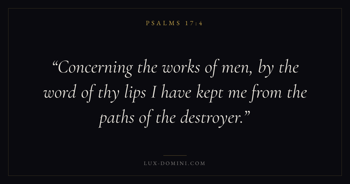 Books / Psalms / Chapter 17 / Verse 4 ← Psalms 17:3 Psalms 17:4 Psalms 17:5 → Concerning the works of men, by the word of thy lips I have kept me from the paths of the destroyer. Download verse card Share on Twitter Share on Facebook Pin it ✦ Key themes FaithPrayerTruthPraise Read with Hebrews 11:1Romans 10:17Matthew 6:9Luke 18:1 Related topics Bible verses about faithBible verses about prayerBible verses about truthBible verses about thankfulness and gratitude ✦ Psalms Chapter 17 verses V. 1 V. 2 V. 3 V. 4 V. 5 V. 6 V. 7 V. 8 V. 9 V. 10 V. 11 V. 12 V. 13 V. 14 V. 15