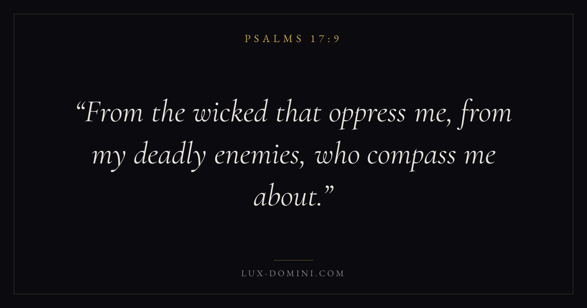 Books / Psalms / Chapter 17 / Verse 9 ← Psalms 17:8 Psalms 17:9 Psalms 17:10 → From the wicked that oppress me, from my deadly enemies, who compass me about. Download verse card Share on Twitter Share on Facebook Pin it ✦ Key themes FaithPrayerJustice and mercyPraise Read with Hebrews 11:1Romans 10:17Matthew 6:9Luke 18:1 Related topics Bible verses about faithBible verses about prayerBible verses about justice and mercyBible verses about thankfulness and gratitude ✦ Psalms Chapter 17 verses V. 1 V. 2 V. 3 V. 4 V. 5 V. 6 V. 7 V. 8 V. 9 V. 10 V. 11 V. 12 V. 13 V. 14 V. 15