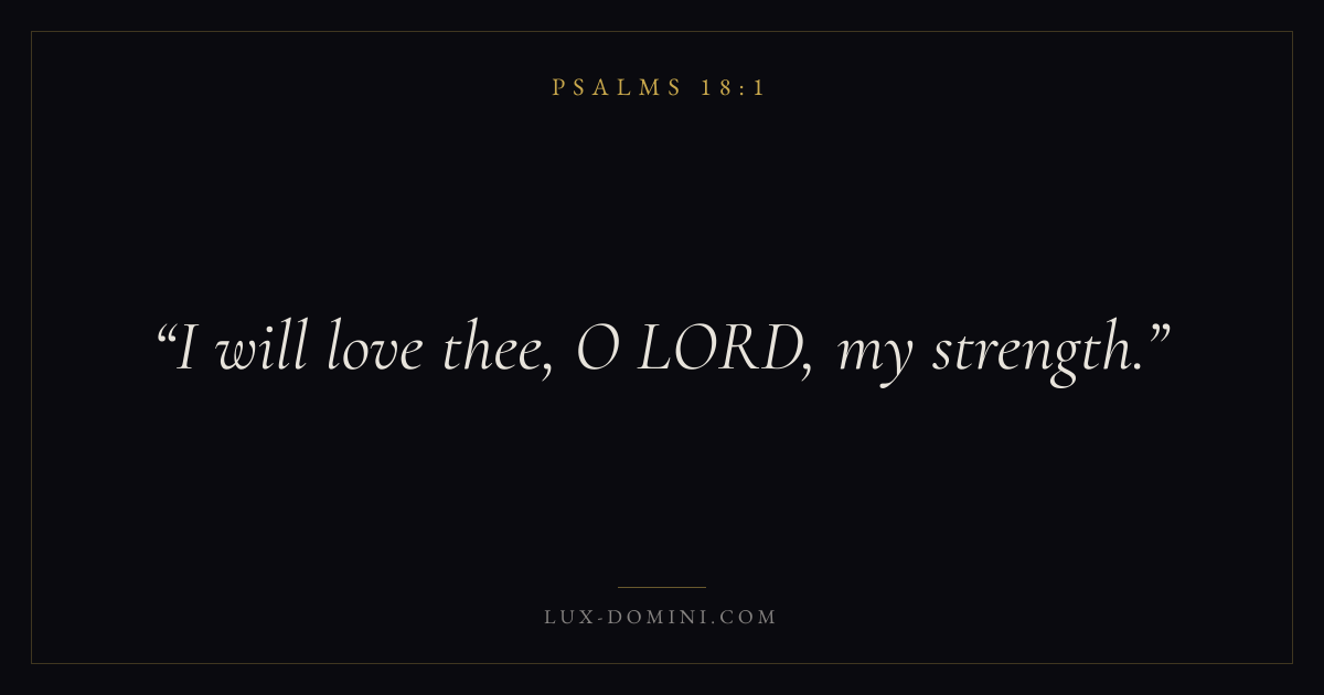 Books / Psalms / Chapter 18 / Verse 1 ← Psalms 17:15 Psalms 18:1 Psalms 18:2 → I will love thee, O LORD, my strength. Download verse card Share on Twitter Share on Facebook Pin it ✦ Key themes LoveFaithPrayerPraise Read with John 3:161 Corinthians 13:4Hebrews 11:1Romans 10:17 Related topics Bible verses about loveBible verses about faithBible verses about prayerBible verses about thankfulness and gratitude ✦ Psalms Chapter 18 verses V. 1 V. 2 V. 3 V. 4 V. 5 V. 6 V. 7 V. 8 V. 9 V. 10 V. 11 V. 12 V. 13 V. 14 V. 15 V. 16 V. 17 V. 18 V. 19 V. 20 V. 21 V. 22 V. 23 V. 24 V. 25 V. 26 V. 27 V. 28 V. 29 V. 30 V. 31 V. 32 V. 33 V. 34 V. 35 V. 36 V. 37 V. 38 V. 39 V. 40 V. 41 V. 42 V. 43 V. 44 V. 45 V. 46 V. 47 V. 48 V. 49 V. 50