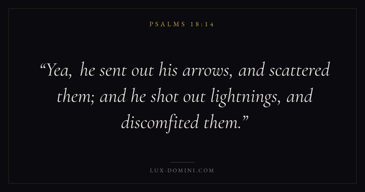 Books / Psalms / Chapter 18 / Verse 14 ← Psalms 18:13 Psalms 18:14 Psalms 18:15 → Yea, he sent out his arrows, and scattered them; and he shot out lightnings, and discomfited them. Download verse card Share on Twitter Share on Facebook Pin it ✦ Key themes LoveFaithPrayerPraise Read with John 3:161 Corinthians 13:4Hebrews 11:1Romans 10:17 Related topics Bible verses about loveBible verses about faithBible verses about prayerBible verses about thankfulness and gratitude ✦ Psalms Chapter 18 verses V. 1 V. 2 V. 3 V. 4 V. 5 V. 6 V. 7 V. 8 V. 9 V. 10 V. 11 V. 12 V. 13 V. 14 V. 15 V. 16 V. 17 V. 18 V. 19 V. 20 V. 21 V. 22 V. 23 V. 24 V. 25 V. 26 V. 27 V. 28 V. 29 V. 30 V. 31 V. 32 V. 33 V. 34 V. 35 V. 36 V. 37 V. 38 V. 39 V. 40 V. 41 V. 42 V. 43 V. 44 V. 45 V. 46 V. 47 V. 48 V. 49 V. 50