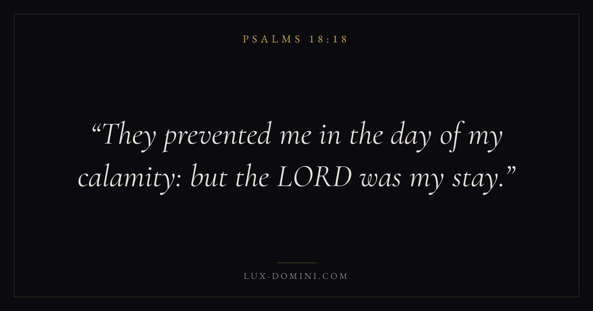 Books / Psalms / Chapter 18 / Verse 18 ← Psalms 18:17 Psalms 18:18 Psalms 18:19 → They prevented me in the day of my calamity: but the LORD was my stay. Download verse card Share on Twitter Share on Facebook Pin it ✦ Key themes LoveFaithPrayerPraise Read with John 3:161 Corinthians 13:4Hebrews 11:1Romans 10:17 Related topics Bible verses about loveBible verses about faithBible verses about prayerBible verses about thankfulness and gratitude ✦ Psalms Chapter 18 verses V. 1 V. 2 V. 3 V. 4 V. 5 V. 6 V. 7 V. 8 V. 9 V. 10 V. 11 V. 12 V. 13 V. 14 V. 15 V. 16 V. 17 V. 18 V. 19 V. 20 V. 21 V. 22 V. 23 V. 24 V. 25 V. 26 V. 27 V. 28 V. 29 V. 30 V. 31 V. 32 V. 33 V. 34 V. 35 V. 36 V. 37 V. 38 V. 39 V. 40 V. 41 V. 42 V. 43 V. 44 V. 45 V. 46 V. 47 V. 48 V. 49 V. 50