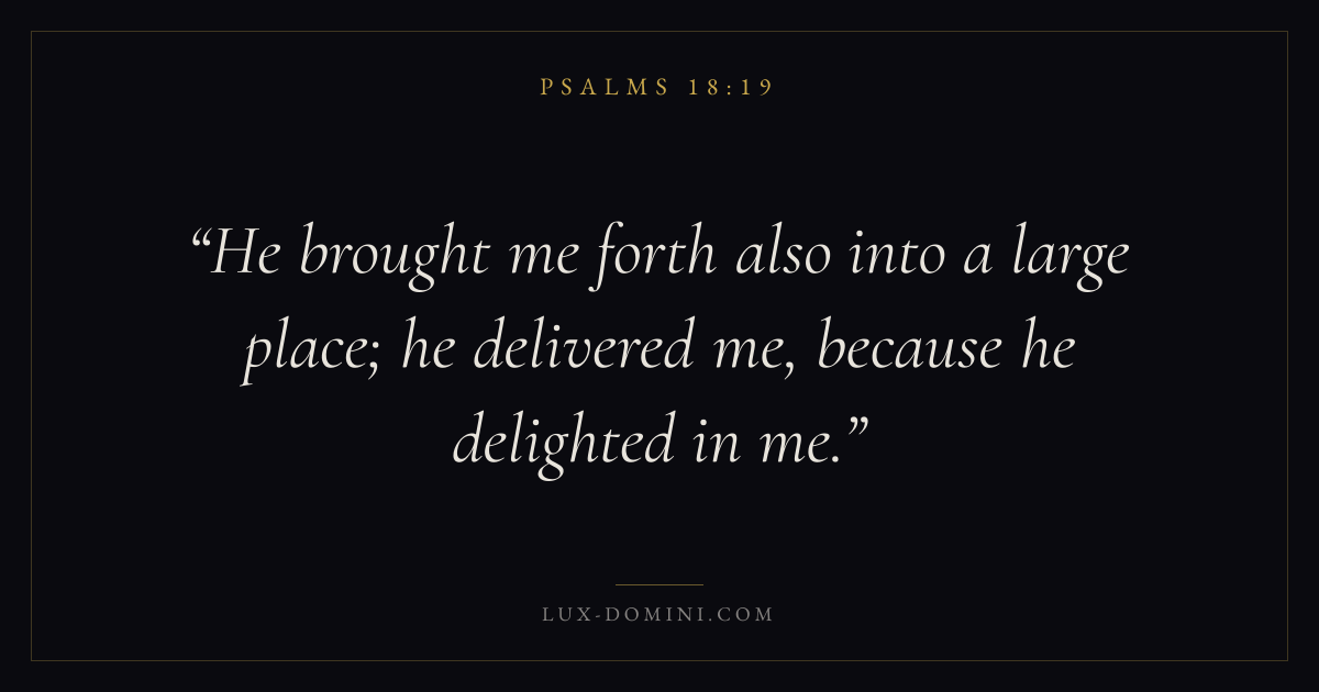 Books / Psalms / Chapter 18 / Verse 19 ← Psalms 18:18 Psalms 18:19 Psalms 18:20 → He brought me forth also into a large place; he delivered me, because he delighted in me. Download verse card Share on Twitter Share on Facebook Pin it ✦ Key themes LoveFaithPrayerPraise Read with John 3:161 Corinthians 13:4Hebrews 11:1Romans 10:17 Related topics Bible verses about loveBible verses about faithBible verses about prayerBible verses about thankfulness and gratitude ✦ Psalms Chapter 18 verses V. 1 V. 2 V. 3 V. 4 V. 5 V. 6 V. 7 V. 8 V. 9 V. 10 V. 11 V. 12 V. 13 V. 14 V. 15 V. 16 V. 17 V. 18 V. 19 V. 20 V. 21 V. 22 V. 23 V. 24 V. 25 V. 26 V. 27 V. 28 V. 29 V. 30 V. 31 V. 32 V. 33 V. 34 V. 35 V. 36 V. 37 V. 38 V. 39 V. 40 V. 41 V. 42 V. 43 V. 44 V. 45 V. 46 V. 47 V. 48 V. 49 V. 50