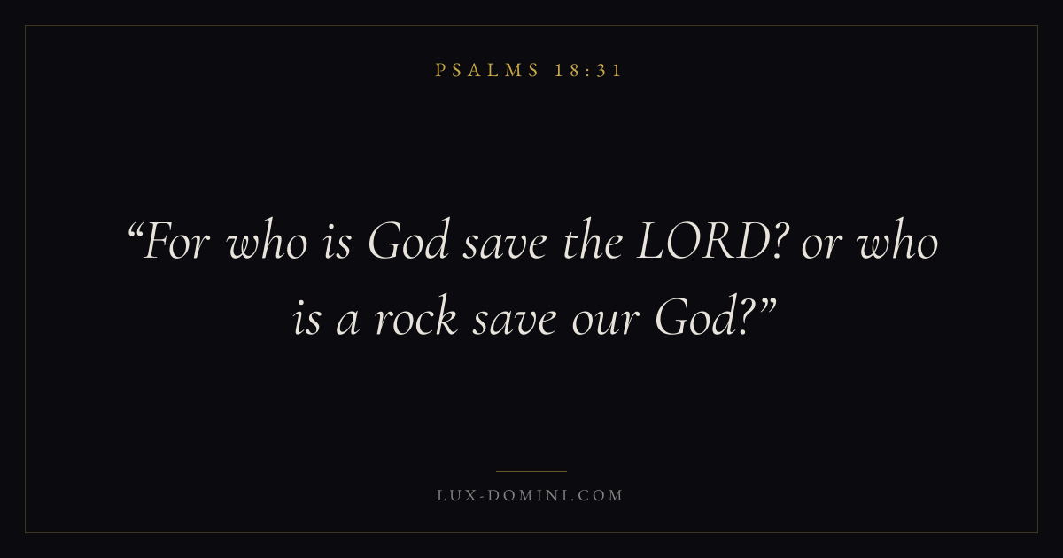 Books / Psalms / Chapter 18 / Verse 31 ← Psalms 18:30 Psalms 18:31 Psalms 18:32 → For who is God save the LORD? or who is a rock save our God? Download verse card Share on Twitter Share on Facebook Pin it ✦ Key themes FaithPrayerJustice and mercySalvationPraise Read with Hebrews 11:1Romans 10:17Matthew 6:9Luke 18:1 Related topics Bible verses about faithBible verses about prayerBible verses about justice and mercyBible verses about salvationBible verses about thankfulness and gratitude ✦ Psalms Chapter 18 verses V. 1 V. 2 V. 3 V. 4 V. 5 V. 6 V. 7 V. 8 V. 9 V. 10 V. 11 V. 12 V. 13 V. 14 V. 15 V. 16 V. 17 V. 18 V. 19 V. 20 V. 21 V. 22 V. 23 V. 24 V. 25 V. 26 V. 27 V. 28 V. 29 V. 30 V. 31 V. 32 V. 33 V. 34 V. 35 V. 36 V. 37 V. 38 V. 39 V. 40 V. 41 V. 42 V. 43 V. 44 V. 45 V. 46 V. 47 V. 48 V. 49 V. 50