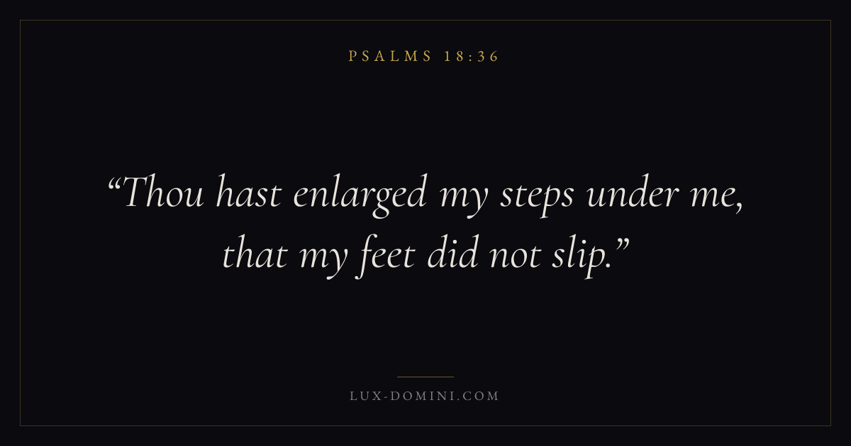 Books / Psalms / Chapter 18 / Verse 36 ← Psalms 18:35 Psalms 18:36 Psalms 18:37 → Thou hast enlarged my steps under me, that my feet did not slip. Download verse card Share on Twitter Share on Facebook Pin it ✦ Key themes FaithPrayerJustice and mercyPraise Read with Hebrews 11:1Romans 10:17Matthew 6:9Luke 18:1 Related topics Bible verses about faithBible verses about prayerBible verses about justice and mercyBible verses about thankfulness and gratitude ✦ Psalms Chapter 18 verses V. 1 V. 2 V. 3 V. 4 V. 5 V. 6 V. 7 V. 8 V. 9 V. 10 V. 11 V. 12 V. 13 V. 14 V. 15 V. 16 V. 17 V. 18 V. 19 V. 20 V. 21 V. 22 V. 23 V. 24 V. 25 V. 26 V. 27 V. 28 V. 29 V. 30 V. 31 V. 32 V. 33 V. 34 V. 35 V. 36 V. 37 V. 38 V. 39 V. 40 V. 41 V. 42 V. 43 V. 44 V. 45 V. 46 V. 47 V. 48 V. 49 V. 50