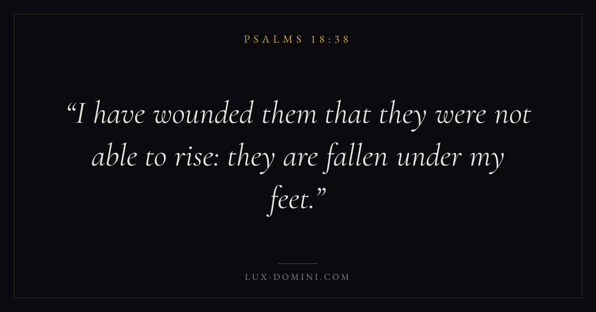 Books / Psalms / Chapter 18 / Verse 38 ← Psalms 18:37 Psalms 18:38 Psalms 18:39 → I have wounded them that they were not able to rise: they are fallen under my feet. Download verse card Share on Twitter Share on Facebook Pin it ✦ Key themes FaithPrayerJustice and mercyPraise Read with Hebrews 11:1Romans 10:17Matthew 6:9Luke 18:1 Related topics Bible verses about faithBible verses about prayerBible verses about justice and mercyBible verses about thankfulness and gratitude ✦ Psalms Chapter 18 verses V. 1 V. 2 V. 3 V. 4 V. 5 V. 6 V. 7 V. 8 V. 9 V. 10 V. 11 V. 12 V. 13 V. 14 V. 15 V. 16 V. 17 V. 18 V. 19 V. 20 V. 21 V. 22 V. 23 V. 24 V. 25 V. 26 V. 27 V. 28 V. 29 V. 30 V. 31 V. 32 V. 33 V. 34 V. 35 V. 36 V. 37 V. 38 V. 39 V. 40 V. 41 V. 42 V. 43 V. 44 V. 45 V. 46 V. 47 V. 48 V. 49 V. 50