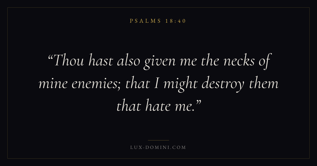 Books / Psalms / Chapter 18 / Verse 40 ← Psalms 18:39 Psalms 18:40 Psalms 18:41 → Thou hast also given me the necks of mine enemies; that I might destroy them that hate me. Download verse card Share on Twitter Share on Facebook Pin it ✦ Key themes FaithPrayerJustice and mercyPraise Read with Hebrews 11:1Romans 10:17Matthew 6:9Luke 18:1 Related topics Bible verses about faithBible verses about prayerBible verses about justice and mercyBible verses about thankfulness and gratitude ✦ Psalms Chapter 18 verses V. 1 V. 2 V. 3 V. 4 V. 5 V. 6 V. 7 V. 8 V. 9 V. 10 V. 11 V. 12 V. 13 V. 14 V. 15 V. 16 V. 17 V. 18 V. 19 V. 20 V. 21 V. 22 V. 23 V. 24 V. 25 V. 26 V. 27 V. 28 V. 29 V. 30 V. 31 V. 32 V. 33 V. 34 V. 35 V. 36 V. 37 V. 38 V. 39 V. 40 V. 41 V. 42 V. 43 V. 44 V. 45 V. 46 V. 47 V. 48 V. 49 V. 50
