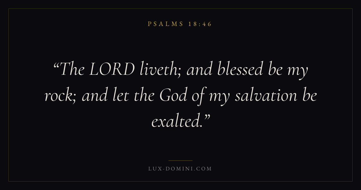 Books / Psalms / Chapter 18 / Verse 46 ← Psalms 18:45 Psalms 18:46 Psalms 18:47 → The LORD liveth; and blessed be my rock; and let the God of my salvation be exalted. Download verse card Share on Twitter Share on Facebook Pin it ✦ Key themes FaithPrayerJustice and mercySalvationPraise Read with Hebrews 11:1Romans 10:17Matthew 6:9Luke 18:1 Related topics Bible verses about faithBible verses about prayerBible verses about justice and mercyBible verses about salvationBible verses about thankfulness and gratitude ✦ Psalms Chapter 18 verses V. 1 V. 2 V. 3 V. 4 V. 5 V. 6 V. 7 V. 8 V. 9 V. 10 V. 11 V. 12 V. 13 V. 14 V. 15 V. 16 V. 17 V. 18 V. 19 V. 20 V. 21 V. 22 V. 23 V. 24 V. 25 V. 26 V. 27 V. 28 V. 29 V. 30 V. 31 V. 32 V. 33 V. 34 V. 35 V. 36 V. 37 V. 38 V. 39 V. 40 V. 41 V. 42 V. 43 V. 44 V. 45 V. 46 V. 47 V. 48 V. 49 V. 50