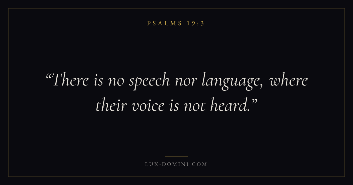 Books / Psalms / Chapter 19 / Verse 3 ← Psalms 19:2 Psalms 19:3 Psalms 19:4 → There is no speech nor language, where their voice is not heard. Download verse card Share on Twitter Share on Facebook Pin it ✦ Key themes FaithPrayerWisdomPraise Read with Hebrews 11:1Romans 10:17Matthew 6:9Luke 18:1 Related topics Bible verses about faithBible verses about prayerBible verses about wisdomBible verses about thankfulness and gratitude ✦ Psalms Chapter 19 verses V. 1 V. 2 V. 3 V. 4 V. 5 V. 6 V. 7 V. 8 V. 9 V. 10 V. 11 V. 12 V. 13 V. 14