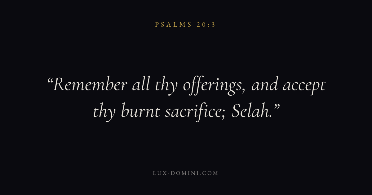 Books / Psalms / Chapter 20 / Verse 3 ← Psalms 20:2 Psalms 20:3 Psalms 20:4 → Remember all thy offerings, and accept thy burnt sacrifice; Selah. Download verse card Share on Twitter Share on Facebook Pin it ✦ Key themes FaithPrayerPraiseLament Read with Hebrews 11:1Romans 10:17Matthew 6:9Luke 18:1 Related topics Bible verses about faithBible verses about prayerBible verses about thankfulness and gratitudeBible verses about grief and loss ✦ Psalms Chapter 20 verses V. 1 V. 2 V. 3 V. 4 V. 5 V. 6 V. 7 V. 8 V. 9