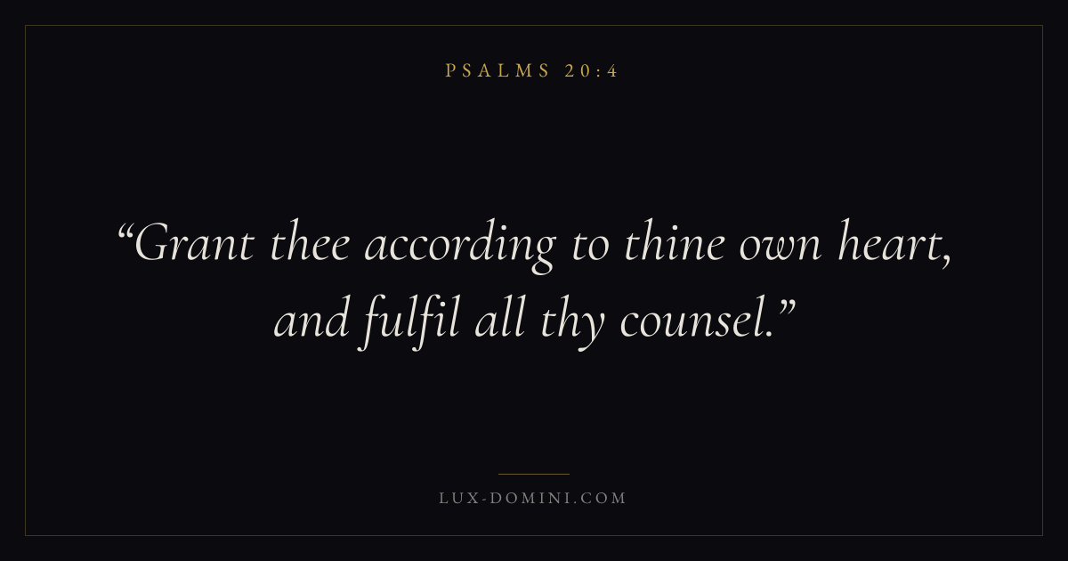 Books / Psalms / Chapter 20 / Verse 4 ← Psalms 20:3 Psalms 20:4 Psalms 20:5 → Grant thee according to thine own heart, and fulfil all thy counsel. Download verse card Share on Twitter Share on Facebook Pin it ✦ Key themes FaithPrayerPraiseLament Read with Hebrews 11:1Romans 10:17Matthew 6:9Luke 18:1 Related topics Bible verses about faithBible verses about prayerBible verses about thankfulness and gratitudeBible verses about grief and loss ✦ Psalms Chapter 20 verses V. 1 V. 2 V. 3 V. 4 V. 5 V. 6 V. 7 V. 8 V. 9