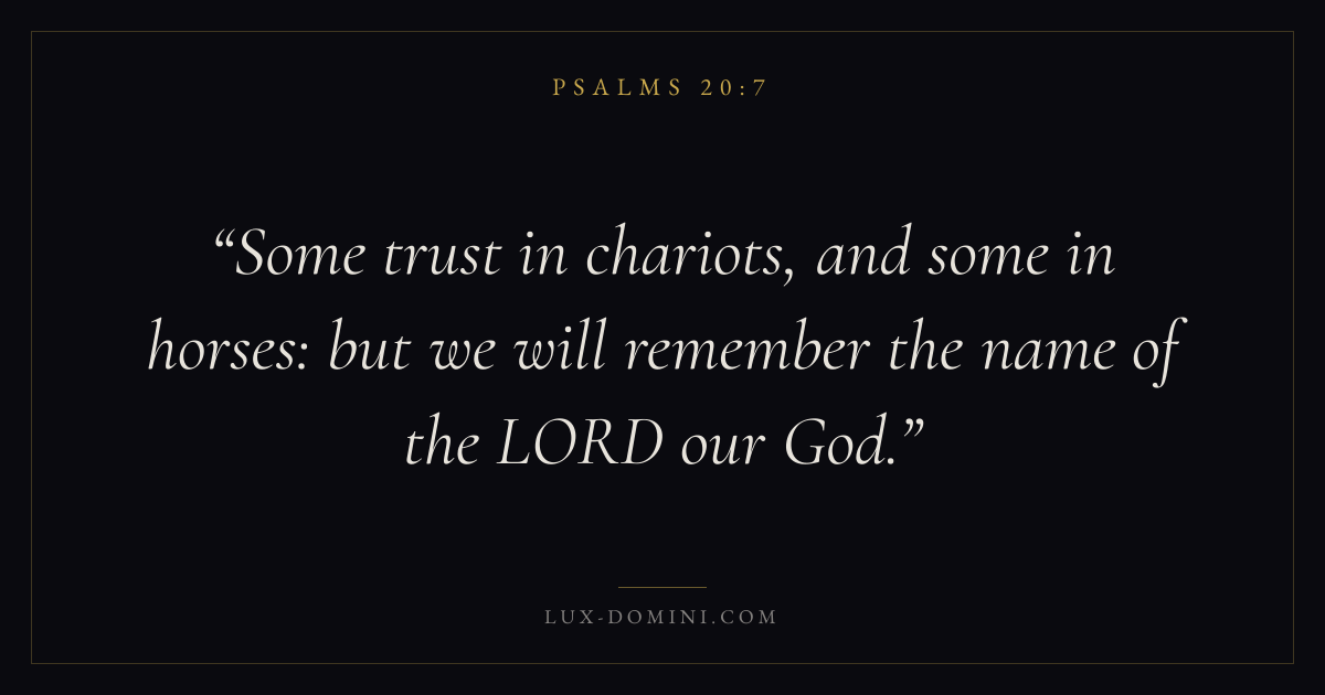 Books / Psalms / Chapter 20 / Verse 7 ← Psalms 20:6 Psalms 20:7 Psalms 20:8 → Some trust in chariots, and some in horses: but we will remember the name of the LORD our God. Download verse card Share on Twitter Share on Facebook Pin it ✦ Key themes FaithPrayerPraiseLament Read with Hebrews 11:1Romans 10:17Matthew 6:9Luke 18:1 Related topics Bible verses about faithBible verses about prayerBible verses about thankfulness and gratitudeBible verses about grief and loss ✦ Psalms Chapter 20 verses V. 1 V. 2 V. 3 V. 4 V. 5 V. 6 V. 7 V. 8 V. 9