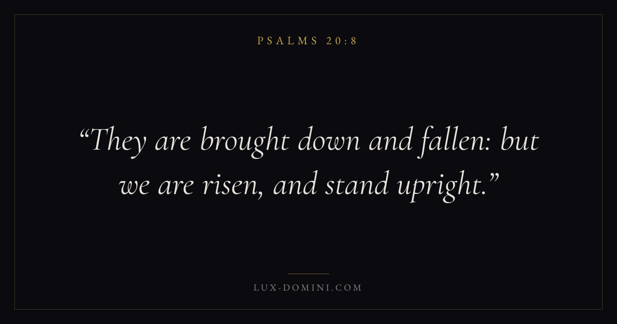 Books / Psalms / Chapter 20 / Verse 8 ← Psalms 20:7 Psalms 20:8 Psalms 20:9 → They are brought down and fallen: but we are risen, and stand upright. Download verse card Share on Twitter Share on Facebook Pin it ✦ Key themes FaithPrayerPraiseLament Read with Hebrews 11:1Romans 10:17Matthew 6:9Luke 18:1 Related topics Bible verses about faithBible verses about prayerBible verses about thankfulness and gratitudeBible verses about grief and loss ✦ Psalms Chapter 20 verses V. 1 V. 2 V. 3 V. 4 V. 5 V. 6 V. 7 V. 8 V. 9
