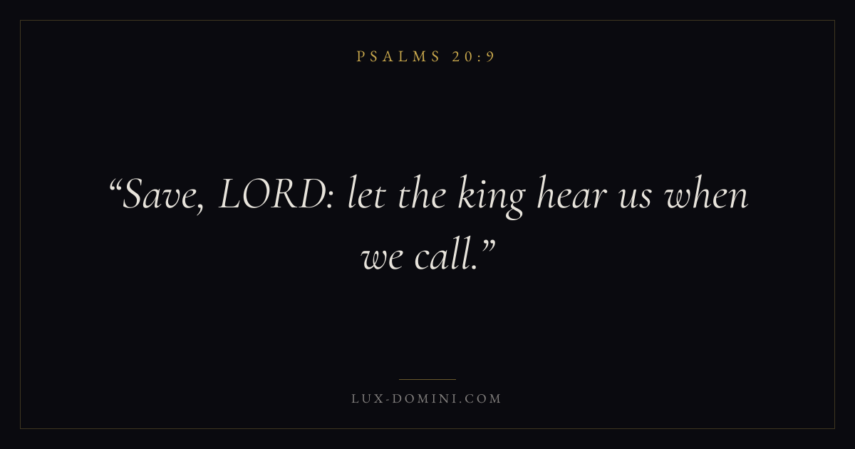Books / Psalms / Chapter 20 / Verse 9 ← Psalms 20:8 Psalms 20:9 Psalms 21:1 → Save, LORD: let the king hear us when we call. Download verse card Share on Twitter Share on Facebook Pin it ✦ Key themes FaithPrayerSalvationPraise Read with Hebrews 11:1Romans 10:17Matthew 6:9Luke 18:1 Related topics Bible verses about faithBible verses about prayerBible verses about salvationBible verses about thankfulness and gratitude ✦ Psalms Chapter 20 verses V. 1 V. 2 V. 3 V. 4 V. 5 V. 6 V. 7 V. 8 V. 9