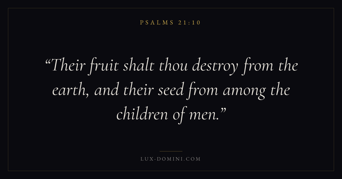 Books / Psalms / Chapter 21 / Verse 10 ← Psalms 21:9 Psalms 21:10 Psalms 21:11 → Their fruit shalt thou destroy from the earth, and their seed from among the children of men. Download verse card Share on Twitter Share on Facebook Pin it ✦ Key themes FaithHopePrayerPraise Read with Hebrews 11:1Romans 10:17Romans 8:24Revelation 21:4 Related topics Bible verses about faithBible verses about hopeBible verses about prayerBible verses about thankfulness and gratitude ✦ Psalms Chapter 21 verses V. 1 V. 2 V. 3 V. 4 V. 5 V. 6 V. 7 V. 8 V. 9 V. 10 V. 11 V. 12 V. 13