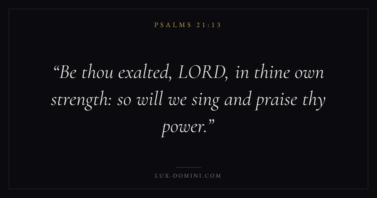 Books / Psalms / Chapter 21 / Verse 13 ← Psalms 21:12 Psalms 21:13 Psalms 22:1 → Be thou exalted, LORD, in thine own strength: so will we sing and praise thy power. Download verse card Share on Twitter Share on Facebook Pin it ✦ Key themes FaithHopePrayerPraise Read with Hebrews 11:1Romans 10:17Romans 8:24Revelation 21:4 Related topics Bible verses about faithBible verses about hopeBible verses about prayerBible verses about thankfulness and gratitude ✦ Psalms Chapter 21 verses V. 1 V. 2 V. 3 V. 4 V. 5 V. 6 V. 7 V. 8 V. 9 V. 10 V. 11 V. 12 V. 13