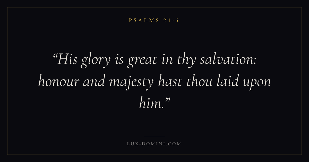 Books / Psalms / Chapter 21 / Verse 5 ← Psalms 21:4 Psalms 21:5 Psalms 21:6 → His glory is great in thy salvation: honour and majesty hast thou laid upon him. Download verse card Share on Twitter Share on Facebook Pin it ✦ Key themes FaithPrayerSalvationPraise Read with Hebrews 11:1Romans 10:17Matthew 6:9Luke 18:1 Related topics Bible verses about faithBible verses about prayerBible verses about salvationBible verses about thankfulness and gratitude ✦ Psalms Chapter 21 verses V. 1 V. 2 V. 3 V. 4 V. 5 V. 6 V. 7 V. 8 V. 9 V. 10 V. 11 V. 12 V. 13