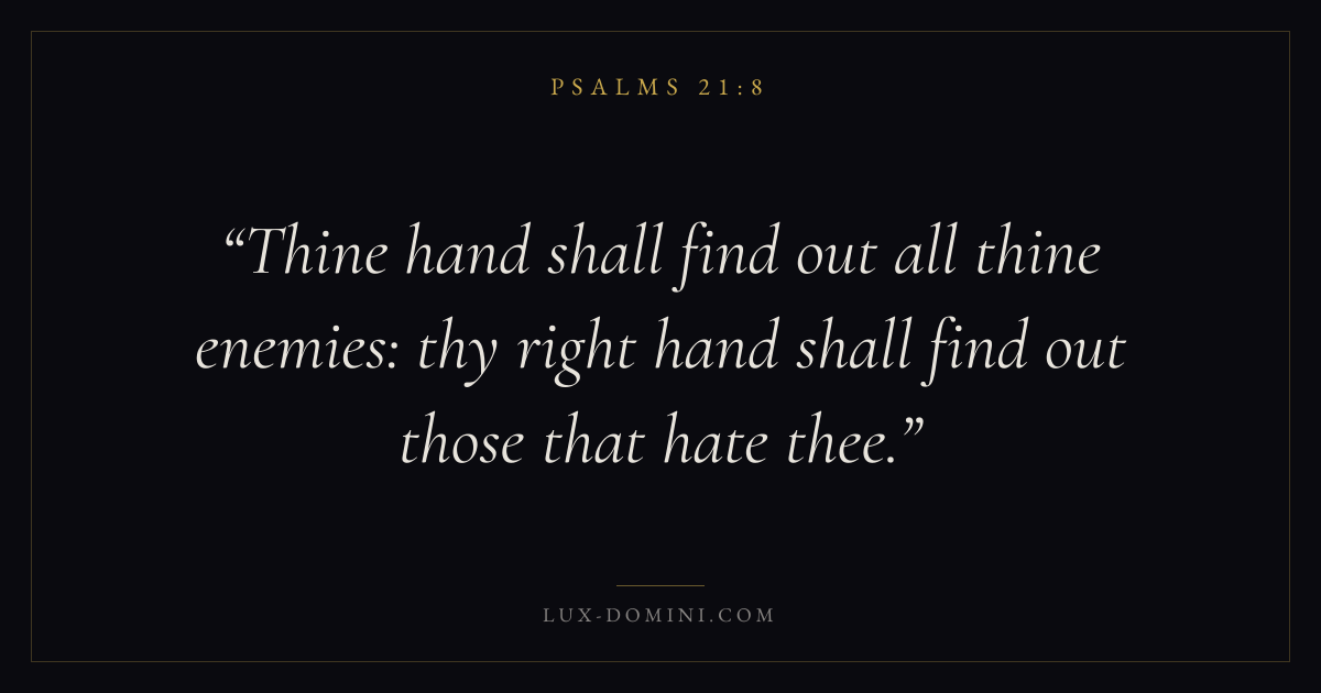 Books / Psalms / Chapter 21 / Verse 8 ← Psalms 21:7 Psalms 21:8 Psalms 21:9 → Thine hand shall find out all thine enemies: thy right hand shall find out those that hate thee. Download verse card Share on Twitter Share on Facebook Pin it ✦ Key themes FaithHopePrayerPraise Read with Hebrews 11:1Romans 10:17Romans 8:24Revelation 21:4 Related topics Bible verses about faithBible verses about hopeBible verses about prayerBible verses about thankfulness and gratitude ✦ Psalms Chapter 21 verses V. 1 V. 2 V. 3 V. 4 V. 5 V. 6 V. 7 V. 8 V. 9 V. 10 V. 11 V. 12 V. 13