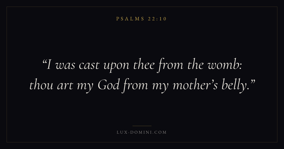 Books / Psalms / Chapter 22 / Verse 10 ← Psalms 22:9 Psalms 22:10 Psalms 22:11 → I was cast upon thee from the womb: thou art my God from my mother’s belly. Download verse card Share on Twitter Share on Facebook Pin it ✦ Key themes FaithPrayerPraiseLament Read with Hebrews 11:1Romans 10:17Matthew 6:9Luke 18:1 Related topics Bible verses about faithBible verses about prayerBible verses about thankfulness and gratitudeBible verses about grief and loss ✦ Psalms Chapter 22 verses V. 1 V. 2 V. 3 V. 4 V. 5 V. 6 V. 7 V. 8 V. 9 V. 10 V. 11 V. 12 V. 13 V. 14 V. 15 V. 16 V. 17 V. 18 V. 19 V. 20 V. 21 V. 22 V. 23 V. 24 V. 25 V. 26 V. 27 V. 28 V. 29 V. 30 V. 31