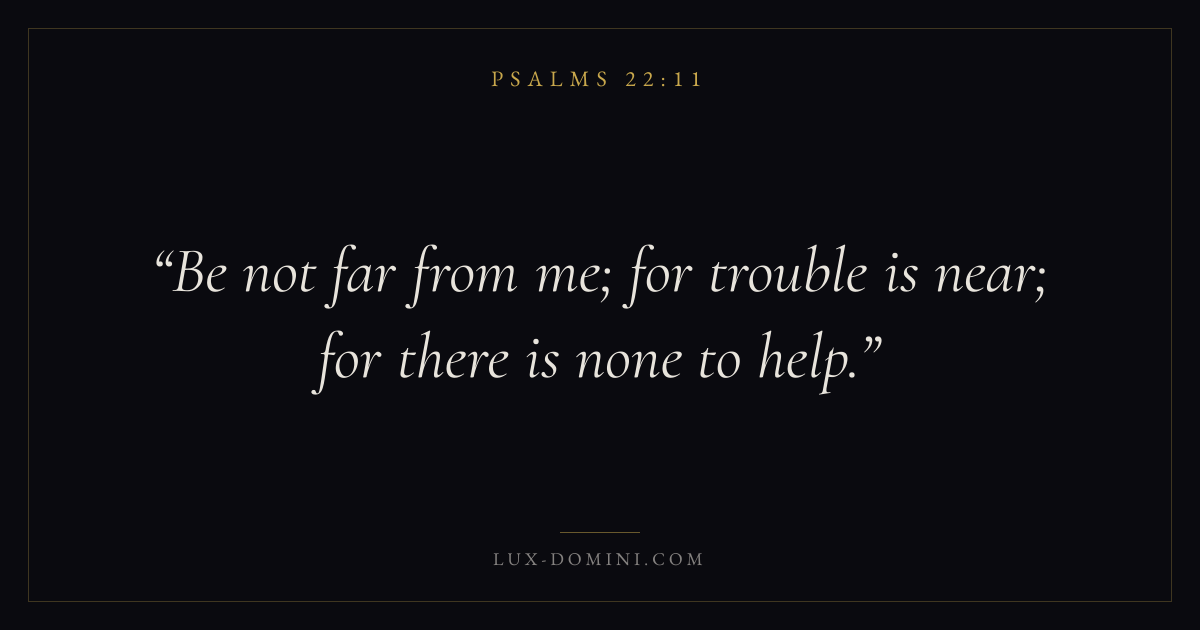 Books / Psalms / Chapter 22 / Verse 11 ← Psalms 22:10 Psalms 22:11 Psalms 22:12 → Be not far from me; for trouble is near; for there is none to help. Download verse card Share on Twitter Share on Facebook Pin it ✦ Key themes FaithSuffering and trialsPrayerPraise Read with Hebrews 11:1Romans 10:17Romans 8:182 Corinthians 4:17 Related topics Bible verses about faithBible verses about suffering and trialsBible verses about prayerBible verses about thankfulness and gratitude ✦ Psalms Chapter 22 verses V. 1 V. 2 V. 3 V. 4 V. 5 V. 6 V. 7 V. 8 V. 9 V. 10 V. 11 V. 12 V. 13 V. 14 V. 15 V. 16 V. 17 V. 18 V. 19 V. 20 V. 21 V. 22 V. 23 V. 24 V. 25 V. 26 V. 27 V. 28 V. 29 V. 30 V. 31