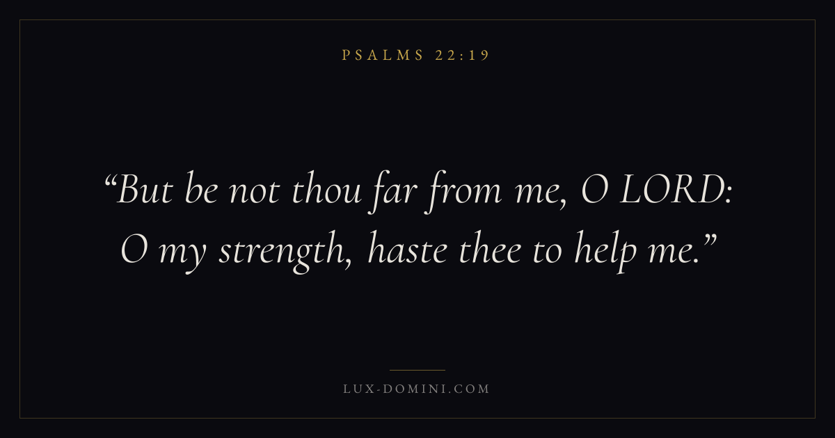 Books / Psalms / Chapter 22 / Verse 19 ← Psalms 22:18 Psalms 22:19 Psalms 22:20 → But be not thou far from me, O LORD: O my strength, haste thee to help me. Download verse card Share on Twitter Share on Facebook Pin it ✦ Key themes FaithSuffering and trialsPrayerPraise Read with Hebrews 11:1Romans 10:17Romans 8:182 Corinthians 4:17 Related topics Bible verses about faithBible verses about suffering and trialsBible verses about prayerBible verses about thankfulness and gratitude ✦ Psalms Chapter 22 verses V. 1 V. 2 V. 3 V. 4 V. 5 V. 6 V. 7 V. 8 V. 9 V. 10 V. 11 V. 12 V. 13 V. 14 V. 15 V. 16 V. 17 V. 18 V. 19 V. 20 V. 21 V. 22 V. 23 V. 24 V. 25 V. 26 V. 27 V. 28 V. 29 V. 30 V. 31