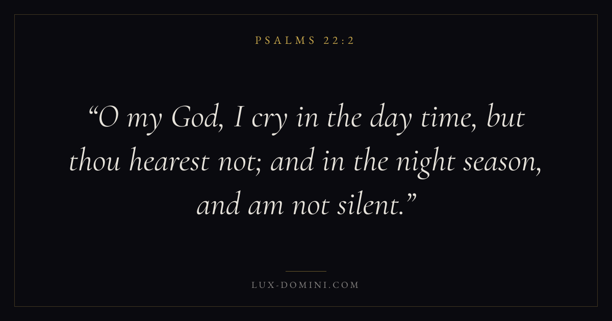 Books / Psalms / Chapter 22 / Verse 2 ← Psalms 22:1 Psalms 22:2 Psalms 22:3 → O my God, I cry in the day time, but thou hearest not; and in the night season, and am not silent. Download verse card Share on Twitter Share on Facebook Pin it ✦ Key themes FaithPrayerPraiseLament Read with Hebrews 11:1Romans 10:17Matthew 6:9Luke 18:1 Related topics Bible verses about faithBible verses about prayerBible verses about thankfulness and gratitudeBible verses about grief and loss ✦ Psalms Chapter 22 verses V. 1 V. 2 V. 3 V. 4 V. 5 V. 6 V. 7 V. 8 V. 9 V. 10 V. 11 V. 12 V. 13 V. 14 V. 15 V. 16 V. 17 V. 18 V. 19 V. 20 V. 21 V. 22 V. 23 V. 24 V. 25 V. 26 V. 27 V. 28 V. 29 V. 30 V. 31