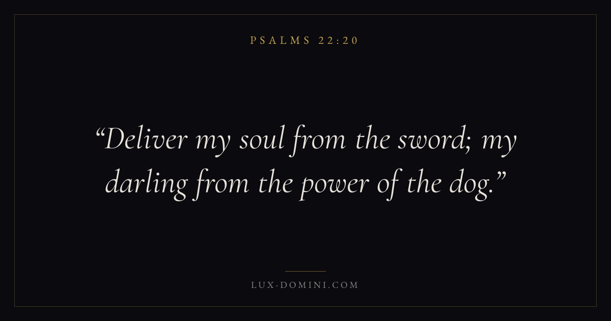 Books / Psalms / Chapter 22 / Verse 20 ← Psalms 22:19 Psalms 22:20 Psalms 22:21 → Deliver my soul from the sword; my darling from the power of the dog. Download verse card Share on Twitter Share on Facebook Pin it ✦ Key themes FaithSuffering and trialsPrayerPraise Read with Hebrews 11:1Romans 10:17Romans 8:182 Corinthians 4:17 Related topics Bible verses about faithBible verses about suffering and trialsBible verses about prayerBible verses about thankfulness and gratitude ✦ Psalms Chapter 22 verses V. 1 V. 2 V. 3 V. 4 V. 5 V. 6 V. 7 V. 8 V. 9 V. 10 V. 11 V. 12 V. 13 V. 14 V. 15 V. 16 V. 17 V. 18 V. 19 V. 20 V. 21 V. 22 V. 23 V. 24 V. 25 V. 26 V. 27 V. 28 V. 29 V. 30 V. 31
