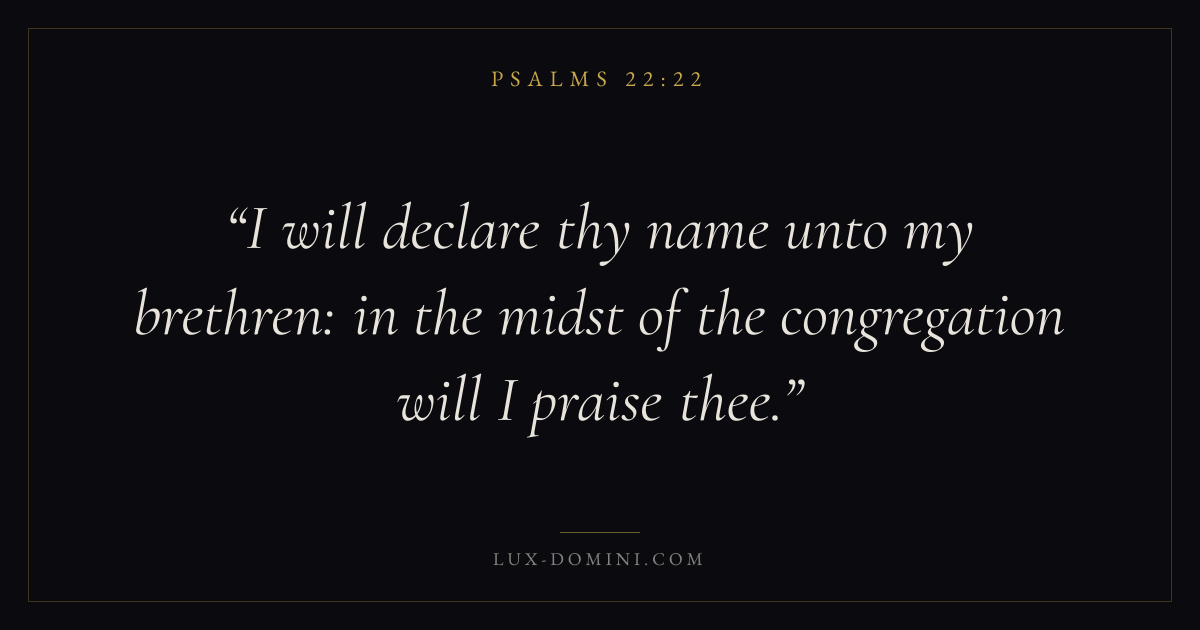 Books / Psalms / Chapter 22 / Verse 22 ← Psalms 22:21 Psalms 22:22 Psalms 22:23 → I will declare thy name unto my brethren: in the midst of the congregation will I praise thee. Download verse card Share on Twitter Share on Facebook Pin it ✦ Key themes FaithPrayerPraiseLament Read with Hebrews 11:1Romans 10:17Matthew 6:9Luke 18:1 Related topics Bible verses about faithBible verses about prayerBible verses about thankfulness and gratitudeBible verses about grief and loss ✦ Psalms Chapter 22 verses V. 1 V. 2 V. 3 V. 4 V. 5 V. 6 V. 7 V. 8 V. 9 V. 10 V. 11 V. 12 V. 13 V. 14 V. 15 V. 16 V. 17 V. 18 V. 19 V. 20 V. 21 V. 22 V. 23 V. 24 V. 25 V. 26 V. 27 V. 28 V. 29 V. 30 V. 31