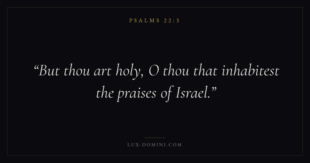 Books / Psalms / Chapter 22 / Verse 3 ← Psalms 22:2 Psalms 22:3 Psalms 22:4 → But thou art holy, O thou that inhabitest the praises of Israel. Download verse card Share on Twitter Share on Facebook Pin it ✦ Key themes FaithPrayerPraiseLament Read with Hebrews 11:1Romans 10:17Matthew 6:9Luke 18:1 Related topics Bible verses about faithBible verses about prayerBible verses about thankfulness and gratitudeBible verses about grief and loss ✦ Psalms Chapter 22 verses V. 1 V. 2 V. 3 V. 4 V. 5 V. 6 V. 7 V. 8 V. 9 V. 10 V. 11 V. 12 V. 13 V. 14 V. 15 V. 16 V. 17 V. 18 V. 19 V. 20 V. 21 V. 22 V. 23 V. 24 V. 25 V. 26 V. 27 V. 28 V. 29 V. 30 V. 31