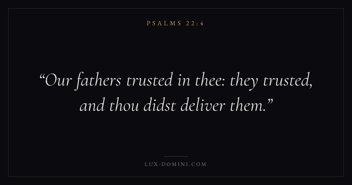 Books / Psalms / Chapter 22 / Verse 4 ← Psalms 22:3 Psalms 22:4 Psalms 22:5 → Our fathers trusted in thee: they trusted, and thou didst deliver them. Download verse card Share on Twitter Share on Facebook Pin it ✦ Key themes FaithPrayerPraiseLament Read with Hebrews 11:1Romans 10:17Matthew 6:9Luke 18:1 Related topics Bible verses about faithBible verses about prayerBible verses about thankfulness and gratitudeBible verses about grief and loss ✦ Psalms Chapter 22 verses V. 1 V. 2 V. 3 V. 4 V. 5 V. 6 V. 7 V. 8 V. 9 V. 10 V. 11 V. 12 V. 13 V. 14 V. 15 V. 16 V. 17 V. 18 V. 19 V. 20 V. 21 V. 22 V. 23 V. 24 V. 25 V. 26 V. 27 V. 28 V. 29 V. 30 V. 31