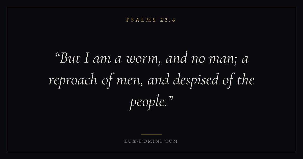 Books / Psalms / Chapter 22 / Verse 6 ← Psalms 22:5 Psalms 22:6 Psalms 22:7 → But I am a worm, and no man; a reproach of men, and despised of the people. Download verse card Share on Twitter Share on Facebook Pin it ✦ Key themes FaithPrayerPraiseLament Read with Hebrews 11:1Romans 10:17Matthew 6:9Luke 18:1 Related topics Bible verses about faithBible verses about prayerBible verses about thankfulness and gratitudeBible verses about grief and loss ✦ Psalms Chapter 22 verses V. 1 V. 2 V. 3 V. 4 V. 5 V. 6 V. 7 V. 8 V. 9 V. 10 V. 11 V. 12 V. 13 V. 14 V. 15 V. 16 V. 17 V. 18 V. 19 V. 20 V. 21 V. 22 V. 23 V. 24 V. 25 V. 26 V. 27 V. 28 V. 29 V. 30 V. 31
