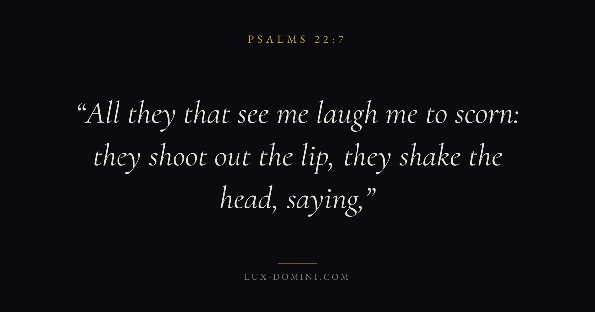 Books / Psalms / Chapter 22 / Verse 7 ← Psalms 22:6 Psalms 22:7 Psalms 22:8 → All they that see me laugh me to scorn: they shoot out the lip, they shake the head, saying, Download verse card Share on Twitter Share on Facebook Pin it ✦ Key themes FaithPrayerPraiseLament Read with Hebrews 11:1Romans 10:17Matthew 6:9Luke 18:1 Related topics Bible verses about faithBible verses about prayerBible verses about thankfulness and gratitudeBible verses about grief and loss ✦ Psalms Chapter 22 verses V. 1 V. 2 V. 3 V. 4 V. 5 V. 6 V. 7 V. 8 V. 9 V. 10 V. 11 V. 12 V. 13 V. 14 V. 15 V. 16 V. 17 V. 18 V. 19 V. 20 V. 21 V. 22 V. 23 V. 24 V. 25 V. 26 V. 27 V. 28 V. 29 V. 30 V. 31