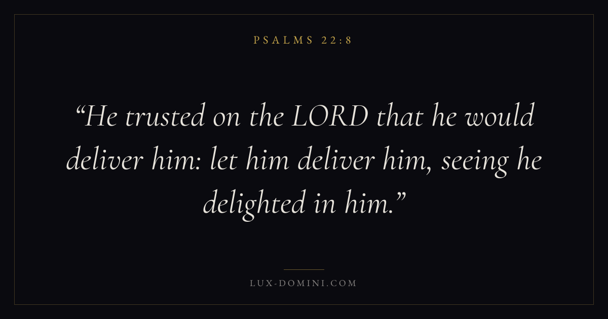 Books / Psalms / Chapter 22 / Verse 8 ← Psalms 22:7 Psalms 22:8 Psalms 22:9 → He trusted on the LORD that he would deliver him: let him deliver him, seeing he delighted in him. Download verse card Share on Twitter Share on Facebook Pin it ✦ Key themes FaithPrayerPraiseLament Read with Hebrews 11:1Romans 10:17Matthew 6:9Luke 18:1 Related topics Bible verses about faithBible verses about prayerBible verses about thankfulness and gratitudeBible verses about grief and loss ✦ Psalms Chapter 22 verses V. 1 V. 2 V. 3 V. 4 V. 5 V. 6 V. 7 V. 8 V. 9 V. 10 V. 11 V. 12 V. 13 V. 14 V. 15 V. 16 V. 17 V. 18 V. 19 V. 20 V. 21 V. 22 V. 23 V. 24 V. 25 V. 26 V. 27 V. 28 V. 29 V. 30 V. 31