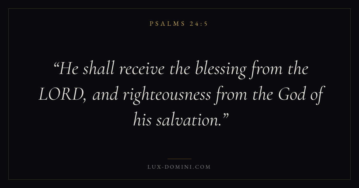 Books / Psalms / Chapter 24 / Verse 5 ← Psalms 24:4 Psalms 24:5 Psalms 24:6 → He shall receive the blessing from the LORD, and righteousness from the God of his salvation. Download verse card Share on Twitter Share on Facebook Pin it ✦ Key themes FaithPrayerSalvationPraise Read with Hebrews 11:1Romans 10:17Matthew 6:9Luke 18:1 Related topics Bible verses about faithBible verses about prayerBible verses about salvationBible verses about thankfulness and gratitude ✦ Psalms Chapter 24 verses V. 1 V. 2 V. 3 V. 4 V. 5 V. 6 V. 7 V. 8 V. 9 V. 10