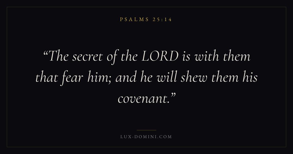 Books / Psalms / Chapter 25 / Verse 14 ← Psalms 25:13 Psalms 25:14 Psalms 25:15 → The secret of the LORD is with them that fear him; and he will shew them his covenant. Download verse card Share on Twitter Share on Facebook Pin it ✦ Key themes FaithHopeAnxiety and fearPrayerPraise Read with Hebrews 11:1Romans 10:17Romans 8:24Revelation 21:4 Related topics Bible verses about faithBible verses about hopeBible verses about anxiety and fearBible verses about prayerBible verses about thankfulness and gratitude ✦ Psalms Chapter 25 verses V. 1 V. 2 V. 3 V. 4 V. 5 V. 6 V. 7 V. 8 V. 9 V. 10 V. 11 V. 12 V. 13 V. 14 V. 15 V. 16 V. 17 V. 18 V. 19 V. 20 V. 21 V. 22