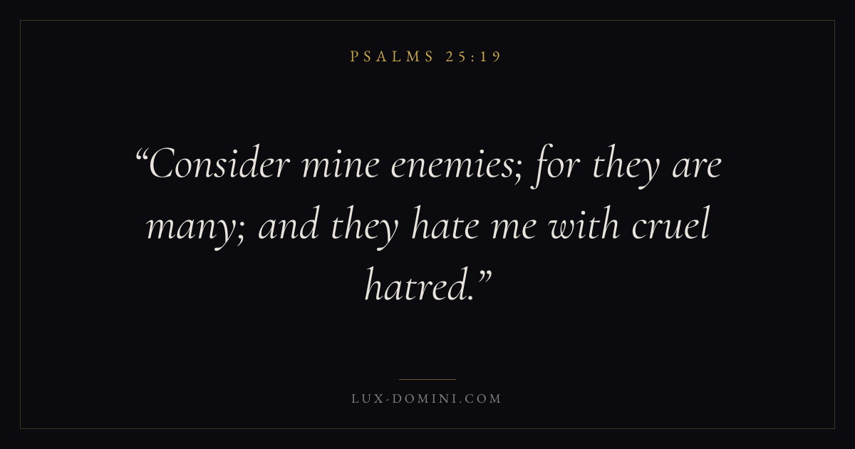 Books / Psalms / Chapter 25 / Verse 19 ← Psalms 25:18 Psalms 25:19 Psalms 25:20 → Consider mine enemies; for they are many; and they hate me with cruel hatred. Download verse card Share on Twitter Share on Facebook Pin it ✦ Key themes FaithHopePrayerSalvationPraise Read with Hebrews 11:1Romans 10:17Romans 8:24Revelation 21:4 Related topics Bible verses about faithBible verses about hopeBible verses about prayerBible verses about salvationBible verses about thankfulness and gratitude ✦ Psalms Chapter 25 verses V. 1 V. 2 V. 3 V. 4 V. 5 V. 6 V. 7 V. 8 V. 9 V. 10 V. 11 V. 12 V. 13 V. 14 V. 15 V. 16 V. 17 V. 18 V. 19 V. 20 V. 21 V. 22