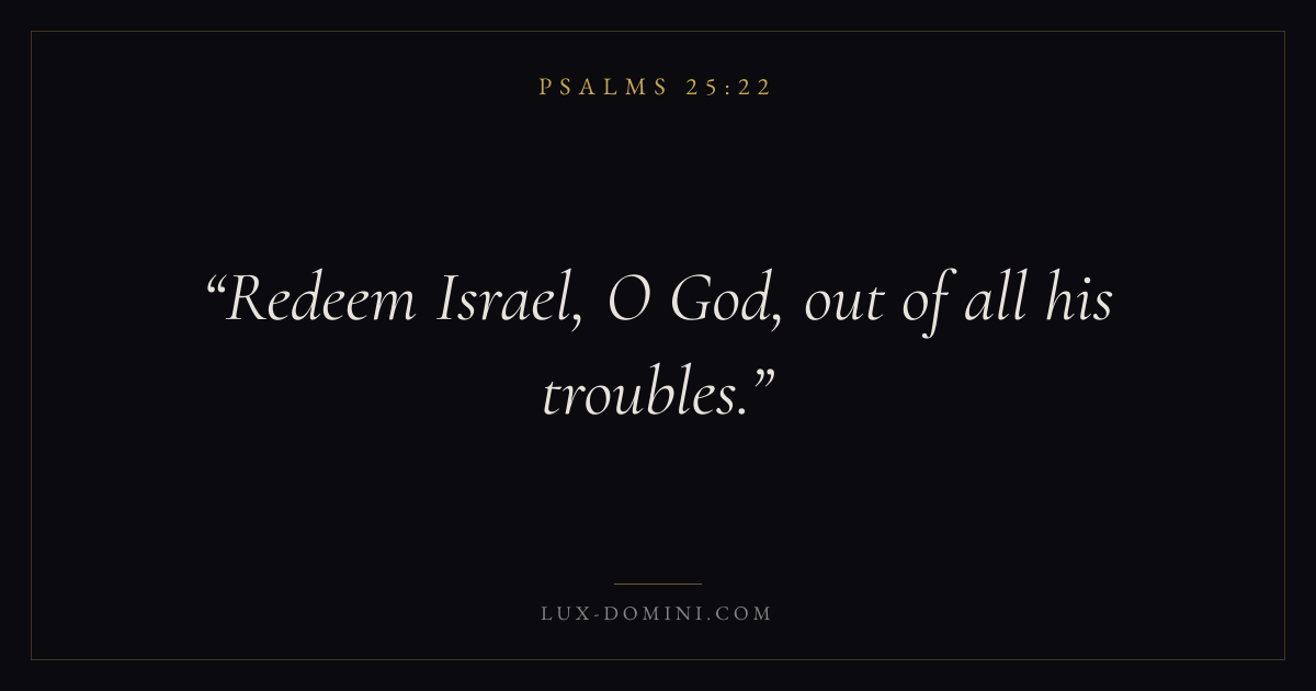 Books / Psalms / Chapter 25 / Verse 22 ← Psalms 25:21 Psalms 25:22 Psalms 26:1 → Redeem Israel, O God, out of all his troubles. Download verse card Share on Twitter Share on Facebook Pin it ✦ Key themes FaithHopePrayerSalvationPraise Read with Hebrews 11:1Romans 10:17Romans 8:24Revelation 21:4 Related topics Bible verses about faithBible verses about hopeBible verses about prayerBible verses about salvationBible verses about thankfulness and gratitude ✦ Psalms Chapter 25 verses V. 1 V. 2 V. 3 V. 4 V. 5 V. 6 V. 7 V. 8 V. 9 V. 10 V. 11 V. 12 V. 13 V. 14 V. 15 V. 16 V. 17 V. 18 V. 19 V. 20 V. 21 V. 22