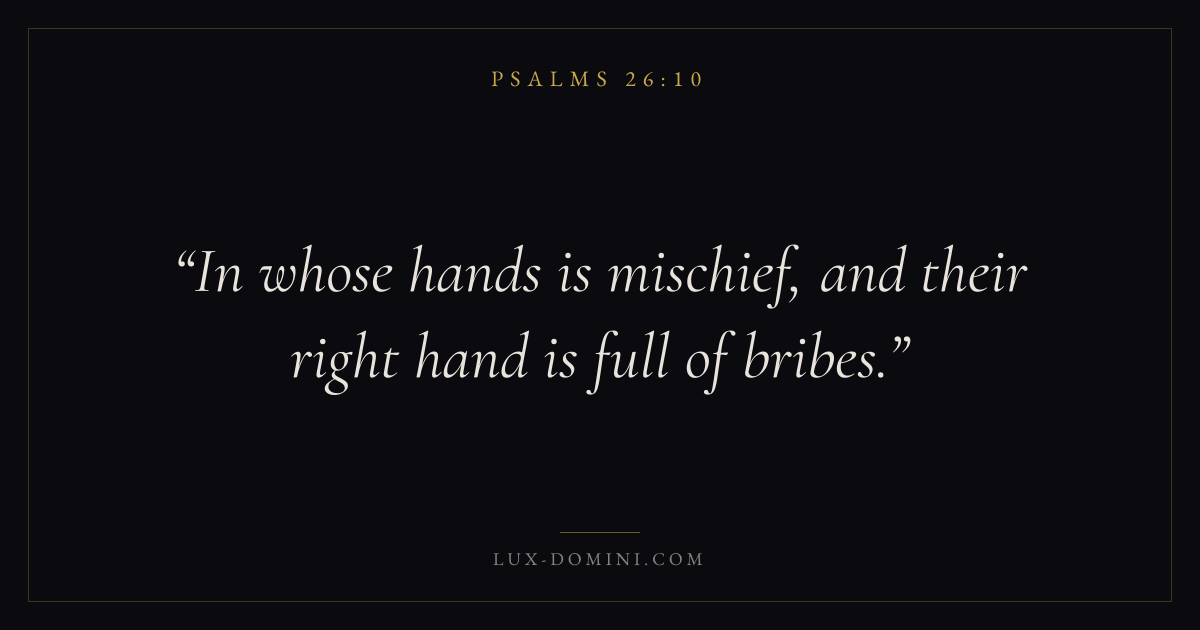 Books / Psalms / Chapter 26 / Verse 10 ← Psalms 26:9 Psalms 26:10 Psalms 26:11 → In whose hands is mischief, and their right hand is full of bribes. Download verse card Share on Twitter Share on Facebook Pin it ✦ Key themes FaithPrayerPraiseLament Read with Hebrews 11:1Romans 10:17Matthew 6:9Luke 18:1 Related topics Bible verses about faithBible verses about prayerBible verses about thankfulness and gratitudeBible verses about grief and loss ✦ Psalms Chapter 26 verses V. 1 V. 2 V. 3 V. 4 V. 5 V. 6 V. 7 V. 8 V. 9 V. 10 V. 11 V. 12