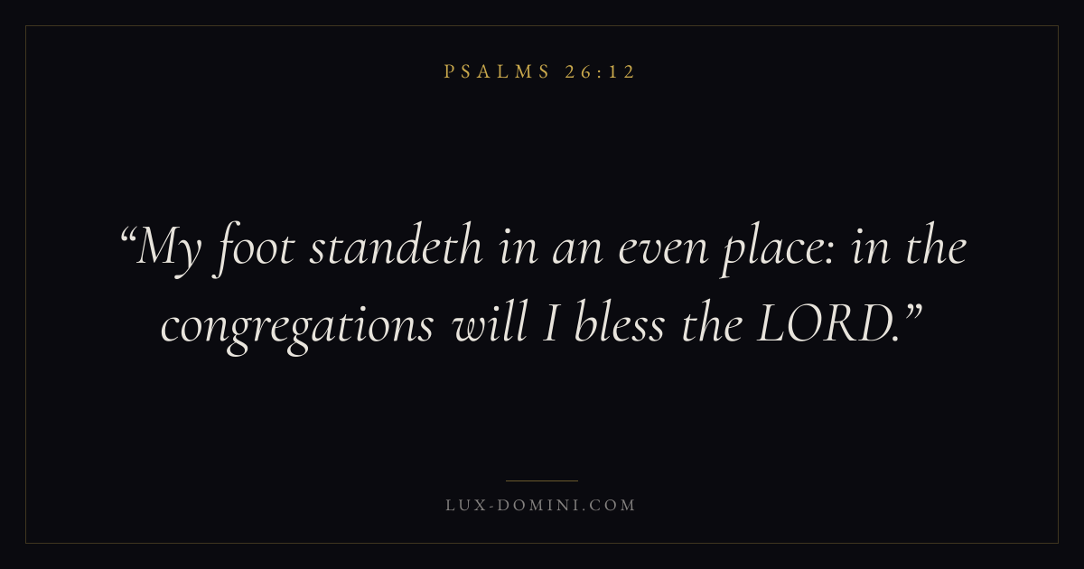 Books / Psalms / Chapter 26 / Verse 12 ← Psalms 26:11 Psalms 26:12 Psalms 27:1 → My foot standeth in an even place: in the congregations will I bless the LORD. Download verse card Share on Twitter Share on Facebook Pin it ✦ Key themes FaithPrayerPraiseLament Read with Hebrews 11:1Romans 10:17Matthew 6:9Luke 18:1 Related topics Bible verses about faithBible verses about prayerBible verses about thankfulness and gratitudeBible verses about grief and loss ✦ Psalms Chapter 26 verses V. 1 V. 2 V. 3 V. 4 V. 5 V. 6 V. 7 V. 8 V. 9 V. 10 V. 11 V. 12