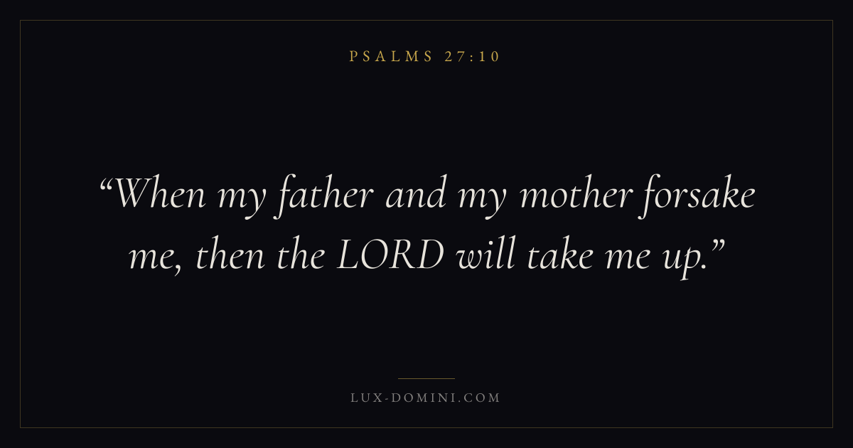 Books / Psalms / Chapter 27 / Verse 10 ← Psalms 27:9 Psalms 27:10 Psalms 27:11 → When my father and my mother forsake me, then the LORD will take me up. Download verse card Share on Twitter Share on Facebook Pin it ✦ Key themes FaithPrayerJustice and mercyGracePraise Read with Hebrews 11:1Romans 10:17Matthew 6:9Luke 18:1 Related topics Bible verses about faithBible verses about prayerBible verses about justice and mercyBible verses about graceBible verses about thankfulness and gratitude ✦ Psalms Chapter 27 verses V. 1 V. 2 V. 3 V. 4 V. 5 V. 6 V. 7 V. 8 V. 9 V. 10 V. 11 V. 12 V. 13 V. 14
