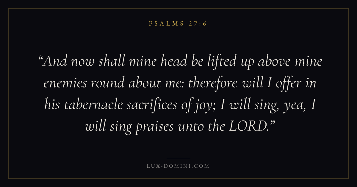 And now shall mine head be lifted up above mine enemies round about me: therefore will I offer in his tabernacle sacrifices of joy; I will sing, yea, I will sing praises unto the LORD.