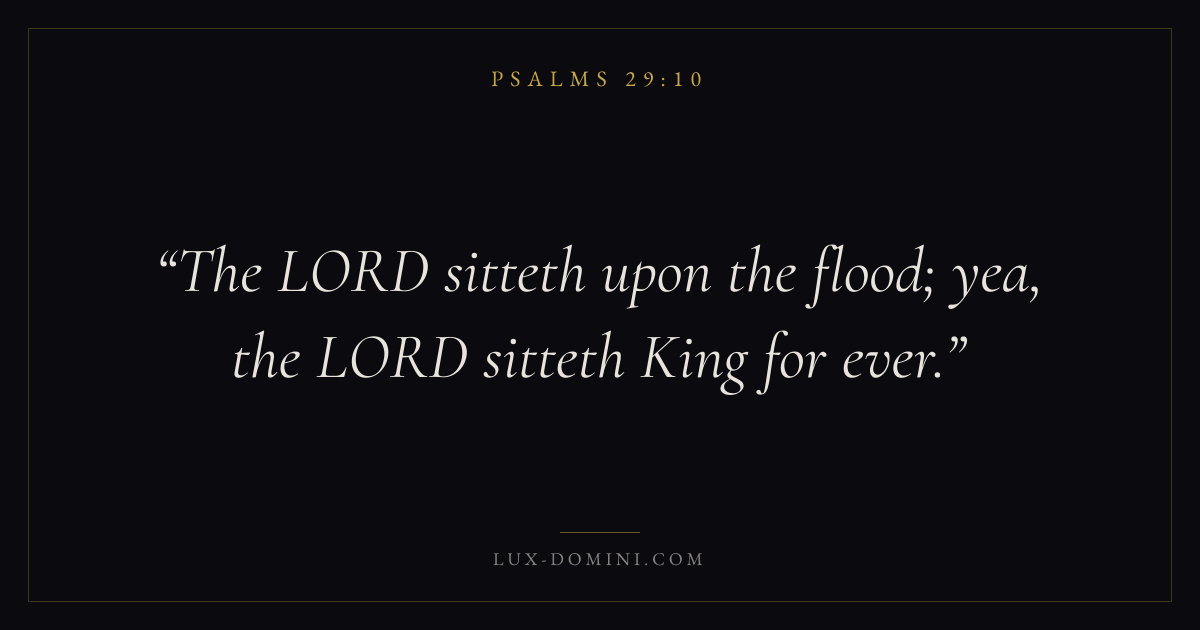 Books / Psalms / Chapter 29 / Verse 10 ← Psalms 29:9 Psalms 29:10 Psalms 29:11 → The LORD sitteth upon the flood; yea, the LORD sitteth King for ever. Download verse card Share on Twitter Share on Facebook Pin it ✦ Key themes FaithPrayerPraiseLament Read with Hebrews 11:1Romans 10:17Matthew 6:9Luke 18:1 Related topics Bible verses about faithBible verses about prayerBible verses about thankfulness and gratitudeBible verses about grief and loss ✦ Psalms Chapter 29 verses V. 1 V. 2 V. 3 V. 4 V. 5 V. 6 V. 7 V. 8 V. 9 V. 10 V. 11