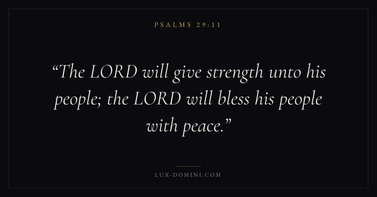 Books / Psalms / Chapter 29 / Verse 11 ← Psalms 29:10 Psalms 29:11 Psalms 30:1 → The LORD will give strength unto his people; the LORD will bless his people with peace. Download verse card Share on Twitter Share on Facebook Pin it ✦ Key themes FaithPrayerPeacePraise Read with Hebrews 11:1Romans 10:17Matthew 6:9Luke 18:1 Related topics Bible verses about peaceBible verses about faithBible verses about prayerBible verses about thankfulness and gratitude ✦ Psalms Chapter 29 verses V. 1 V. 2 V. 3 V. 4 V. 5 V. 6 V. 7 V. 8 V. 9 V. 10 V. 11