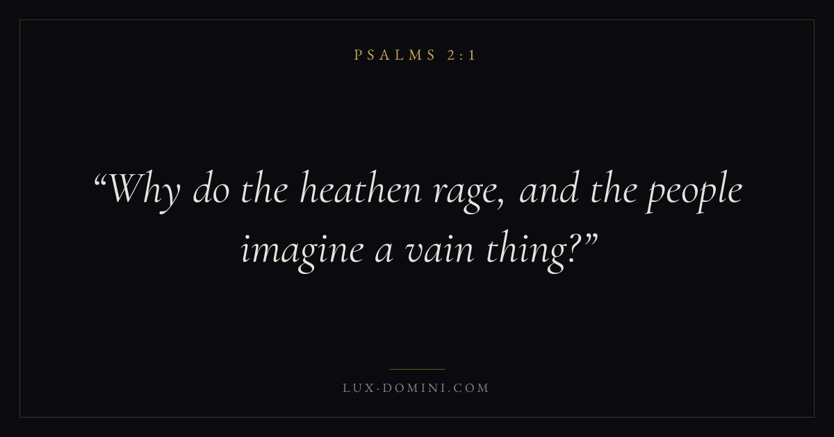 Books / Psalms / Chapter 2 / Verse 1 ← Psalms 1:6 Psalms 2:1 Psalms 2:2 → Why do the heathen rage, and the people imagine a vain thing? Download verse card Share on Twitter Share on Facebook Pin it ✦ Key themes FaithPrayerPraiseLament Read with Hebrews 11:1Romans 10:17Matthew 6:9Luke 18:1 Related topics Bible verses about faithBible verses about prayerBible verses about thankfulness and gratitudeBible verses about grief and loss ✦ Psalms Chapter 2 verses V. 1 V. 2 V. 3 V. 4 V. 5 V. 6 V. 7 V. 8 V. 9 V. 10 V. 11 V. 12