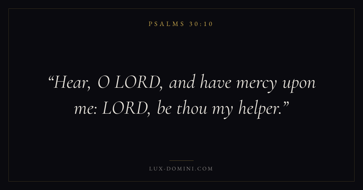 Books / Psalms / Chapter 30 / Verse 10 ← Psalms 30:9 Psalms 30:10 Psalms 30:11 → Hear, O LORD, and have mercy upon me: LORD, be thou my helper. Download verse card Share on Twitter Share on Facebook Pin it ✦ Key themes FaithPrayerJustice and mercyPraise Read with Hebrews 11:1Romans 10:17Matthew 6:9Luke 18:1 Related topics Bible verses about faithBible verses about prayerBible verses about justice and mercyBible verses about thankfulness and gratitude ✦ Psalms Chapter 30 verses V. 1 V. 2 V. 3 V. 4 V. 5 V. 6 V. 7 V. 8 V. 9 V. 10 V. 11 V. 12