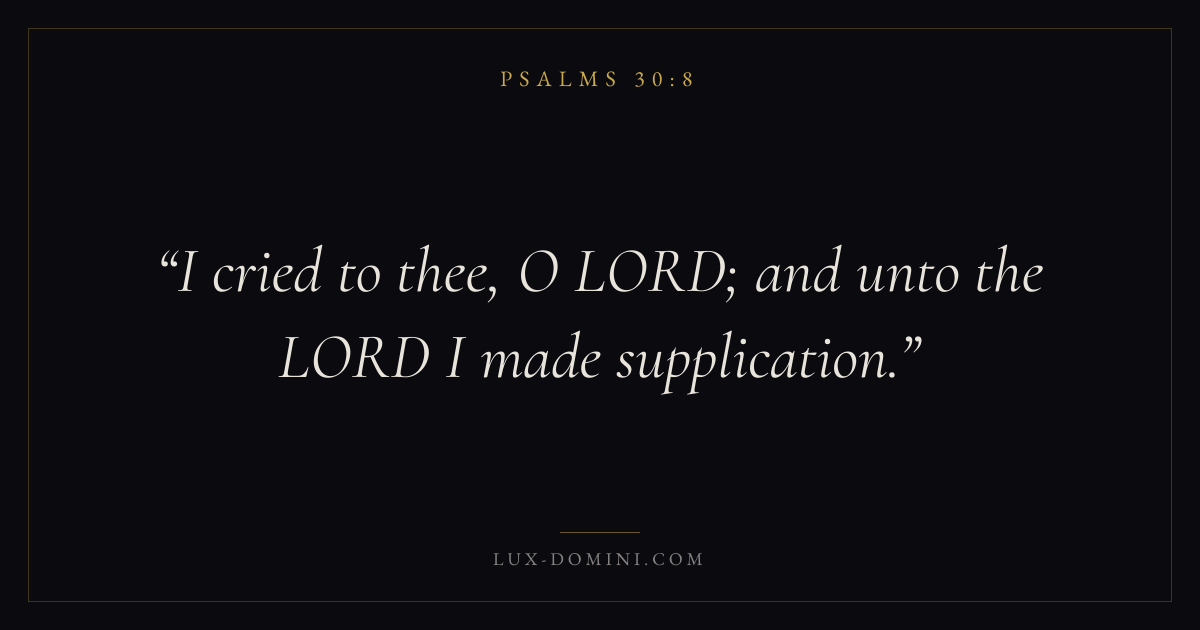 Books / Psalms / Chapter 30 / Verse 8 ← Psalms 30:7 Psalms 30:8 Psalms 30:9 → I cried to thee, O LORD; and unto the LORD I made supplication. Download verse card Share on Twitter Share on Facebook Pin it ✦ Key themes FaithPrayerPraiseLament Read with Hebrews 11:1Romans 10:17Matthew 6:9Luke 18:1 Related topics Bible verses about faithBible verses about prayerBible verses about thankfulness and gratitudeBible verses about grief and loss ✦ Psalms Chapter 30 verses V. 1 V. 2 V. 3 V. 4 V. 5 V. 6 V. 7 V. 8 V. 9 V. 10 V. 11 V. 12