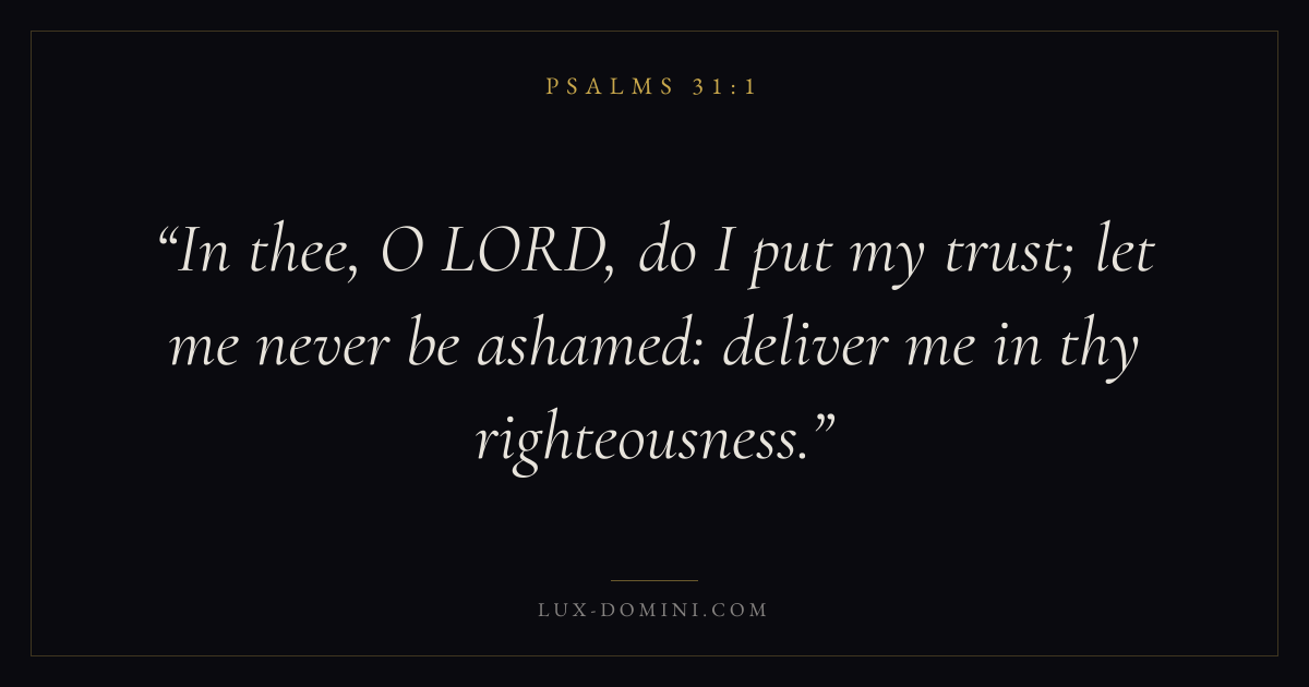 Books / Psalms / Chapter 31 / Verse 1 ← Psalms 30:12 Psalms 31:1 Psalms 31:2 → In thee, O LORD, do I put my trust; let me never be ashamed: deliver me in thy righteousness. Download verse card Share on Twitter Share on Facebook Pin it ✦ Key themes FaithPrayerPraiseLament Read with Hebrews 11:1Romans 10:17Matthew 6:9Luke 18:1 Related topics Bible verses about faithBible verses about prayerBible verses about thankfulness and gratitudeBible verses about grief and loss ✦ Psalms Chapter 31 verses V. 1 V. 2 V. 3 V. 4 V. 5 V. 6 V. 7 V. 8 V. 9 V. 10 V. 11 V. 12 V. 13 V. 14 V. 15 V. 16 V. 17 V. 18 V. 19 V. 20 V. 21 V. 22 V. 23 V. 24