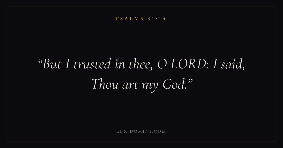 Books / Psalms / Chapter 31 / Verse 14 ← Psalms 31:13 Psalms 31:14 Psalms 31:15 → But I trusted in thee, O LORD: I said, Thou art my God. Download verse card Share on Twitter Share on Facebook Pin it ✦ Key themes FaithSuffering and trialsPrayerPraise Read with Hebrews 11:1Romans 10:17Romans 8:182 Corinthians 4:17 Related topics Bible verses about faithBible verses about suffering and trialsBible verses about prayerBible verses about thankfulness and gratitude ✦ Psalms Chapter 31 verses V. 1 V. 2 V. 3 V. 4 V. 5 V. 6 V. 7 V. 8 V. 9 V. 10 V. 11 V. 12 V. 13 V. 14 V. 15 V. 16 V. 17 V. 18 V. 19 V. 20 V. 21 V. 22 V. 23 V. 24