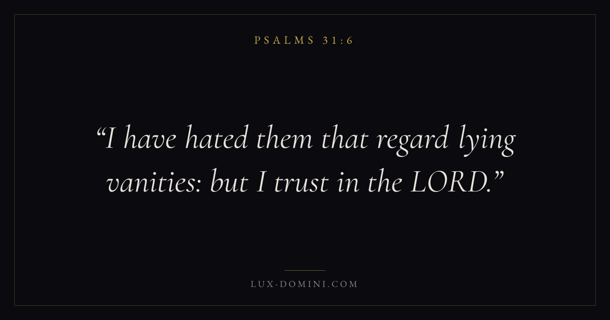 Books / Psalms / Chapter 31 / Verse 6 ← Psalms 31:5 Psalms 31:6 Psalms 31:7 → I have hated them that regard lying vanities: but I trust in the LORD. Download verse card Share on Twitter Share on Facebook Pin it ✦ Key themes FaithPrayerPraiseLament Read with Hebrews 11:1Romans 10:17Matthew 6:9Luke 18:1 Related topics Bible verses about faithBible verses about prayerBible verses about thankfulness and gratitudeBible verses about grief and loss ✦ Psalms Chapter 31 verses V. 1 V. 2 V. 3 V. 4 V. 5 V. 6 V. 7 V. 8 V. 9 V. 10 V. 11 V. 12 V. 13 V. 14 V. 15 V. 16 V. 17 V. 18 V. 19 V. 20 V. 21 V. 22 V. 23 V. 24