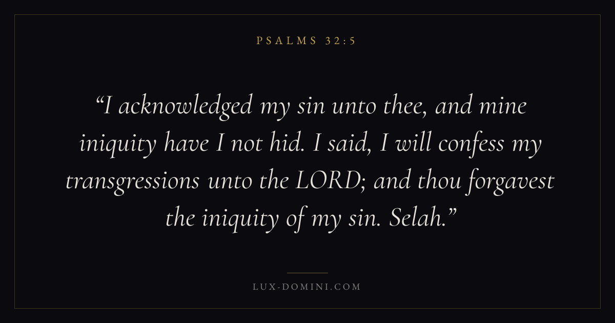 I acknowledged my sin unto thee, and mine iniquity have I not hid. I said, I will confess my transgressions unto the LORD; and thou forgavest the iniquity of my sin. Selah.