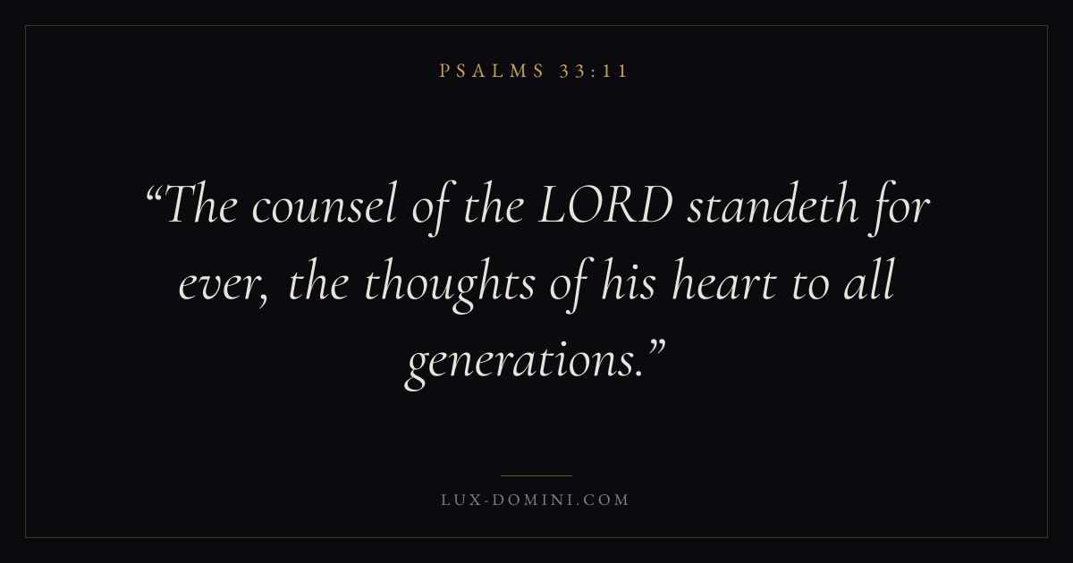 Books / Psalms / Chapter 33 / Verse 11 ← Psalms 33:10 Psalms 33:11 Psalms 33:12 → The counsel of the LORD standeth for ever, the thoughts of his heart to all generations. Download verse card Share on Twitter Share on Facebook Pin it ✦ Key themes FaithPrayerPraiseLament Read with Hebrews 11:1Romans 10:17Matthew 6:9Luke 18:1 Related topics Bible verses about faithBible verses about prayerBible verses about thankfulness and gratitudeBible verses about grief and loss ✦ Psalms Chapter 33 verses V. 1 V. 2 V. 3 V. 4 V. 5 V. 6 V. 7 V. 8 V. 9 V. 10 V. 11 V. 12 V. 13 V. 14 V. 15 V. 16 V. 17 V. 18 V. 19 V. 20 V. 21 V. 22
